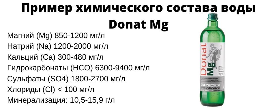 Для примера возьмем другую воду, относящуюся к категории лечебных вод,  Donat Mg: